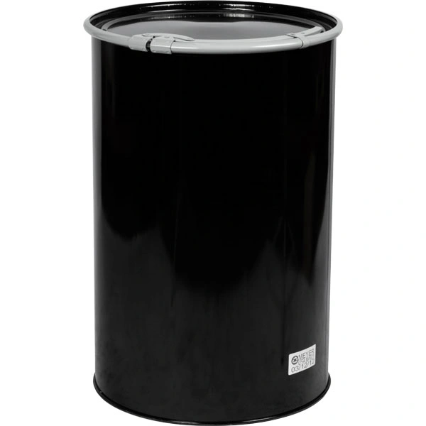 This black 55 gallon straight sided open head steel drum has a rust inhibitor. This steel drum has a black cover with a sponge rubber gasket and a lever lock ring closure. The lever lock ring holds the cover on to the container with a latch (or toggle) that is pulled from one side to the other and applies torque to the two ring ends in a similar fashion to the bolt ring. No torque wrench is required to confirm proper closure. It meets strict wall thickness requirements, 1.2/0.9/1.2 mm or 18/20/18 gauge (top/body/bottom) ASTM grade carbon steel, and is tested for strength and durability.