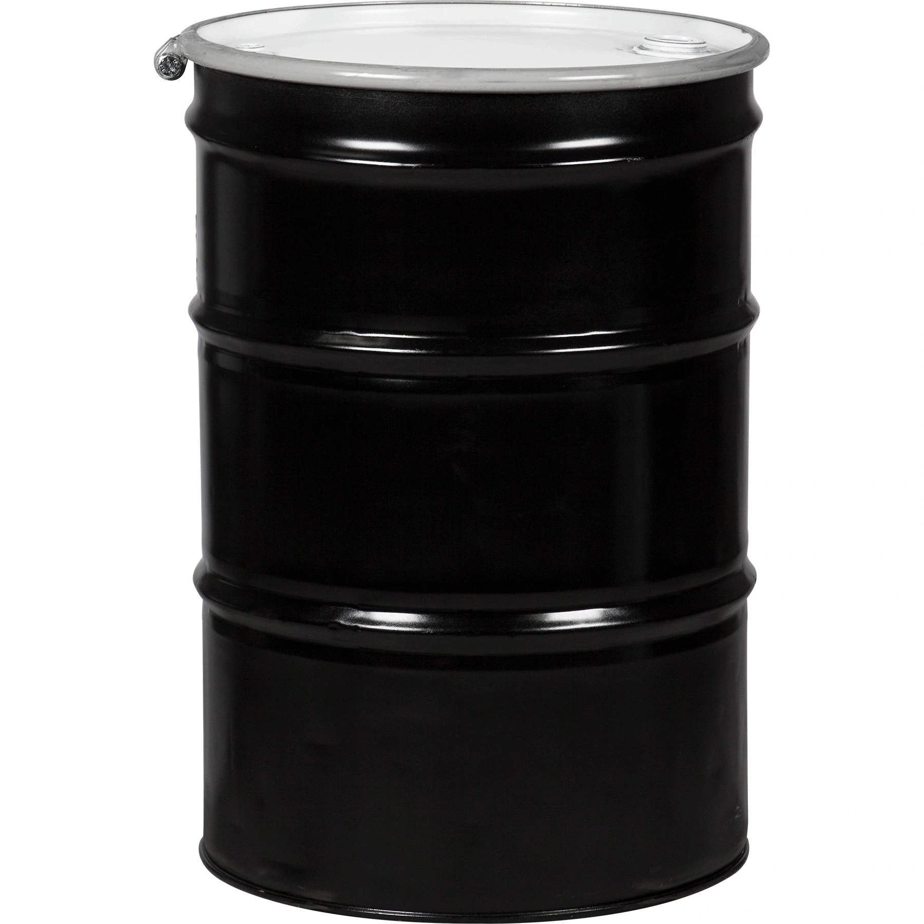 55 Gallon Steel Drum, Black, UN Rated, Lined, Cover w/Bolt Ring, 2″ & 3/4″ Fittings