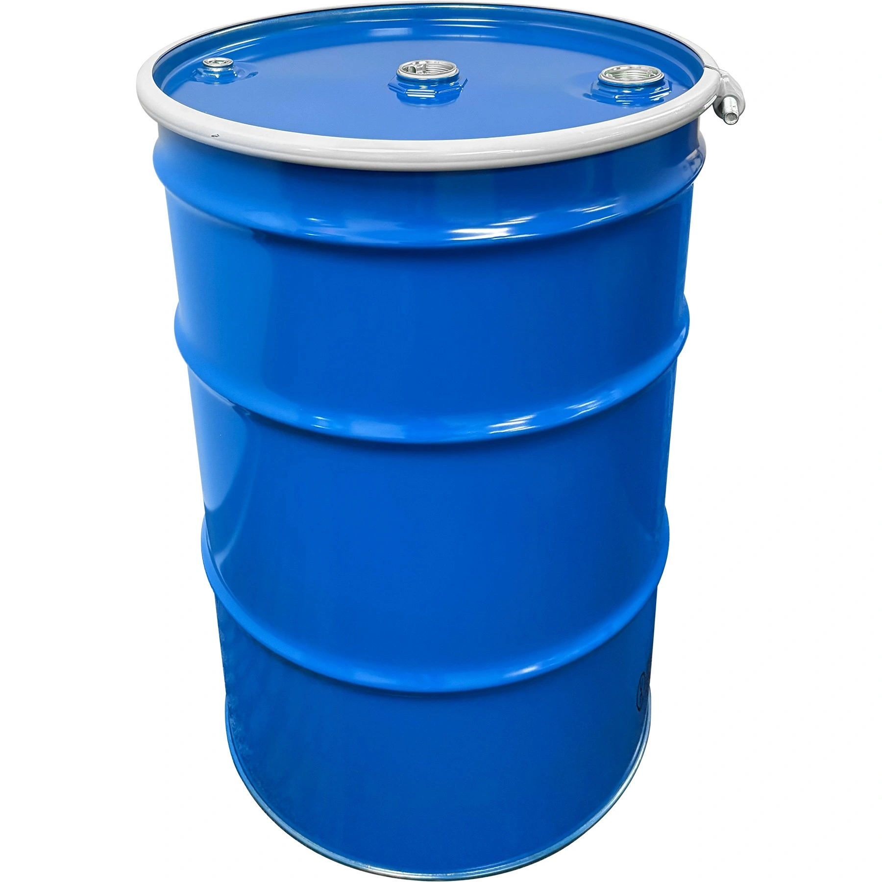 55 Gallon Steel Drum, Blue, UN Rated, Unlined, Blue Cover w/Bolt Ring, Two 2″ Fittings & One 3/4″ Fitting